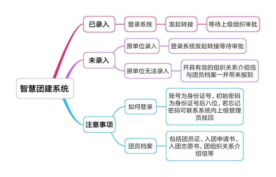 (二)若未录入“智慧团建”系统 ,请在原单位录入后再进行组织关系转接,或开具有效的团组织关系介绍信与团员档案一起带来报到。