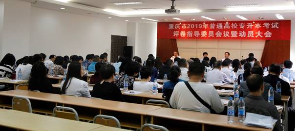 4月18日下午,重庆市2019年普通高校专升本考试评卷指导委员会议暨动员大会在我校沙坪坝校区办公大楼215会议室召开。市教育考试院副院长杨海波、市纪委监委驻市教委纪检监察组监察二室谢明轩主任、市教育考试院成人高校和中等学校入学考试处处长胡松涛、明升体育88m88,m88.com院长李荣等领导出席会议。各学科指导委员、评卷教师代表,市教委、市教育考试院、明升体育88相关职能部门同志参加会议。会议由胡松涛处长主持。