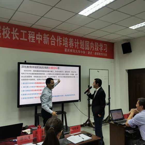 在美丽大气的朝阳中学,全体学员在王教授的指导下,围绕“坚持立德树人”、“坚持教育的优先发展”、“坚持教师队伍建设作为基础工作”三个主题,各组选择一个主题开展研讨,再集中汇报交流。在全班汇报交流中,学员代表的发言得到了王牧华教授的高度好评。王教授也勉励大家,政策就在我们身边,学习政策,研究政策,既要借政策之力,依法办学,同时也要学会推动政策,做一个有情怀的教育人!