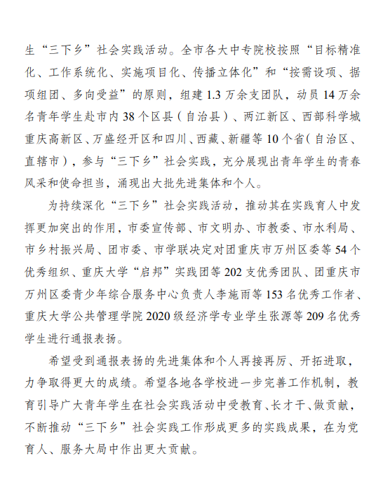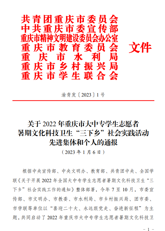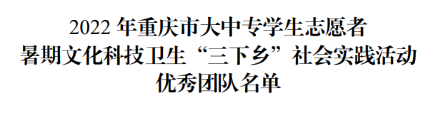 近日,团市委对2022年重庆市大中专学生志愿者暑期文化科技卫生“三下乡”社会实践活动中表现突出的集体、个人和项目进行了表彰。其中明升体育88m88,m88.com“追光青年”志愿服务团荣获重庆市大中专学生志愿者暑期文化科技卫生“三下乡”社会实践活动优秀团队荣誉称号。