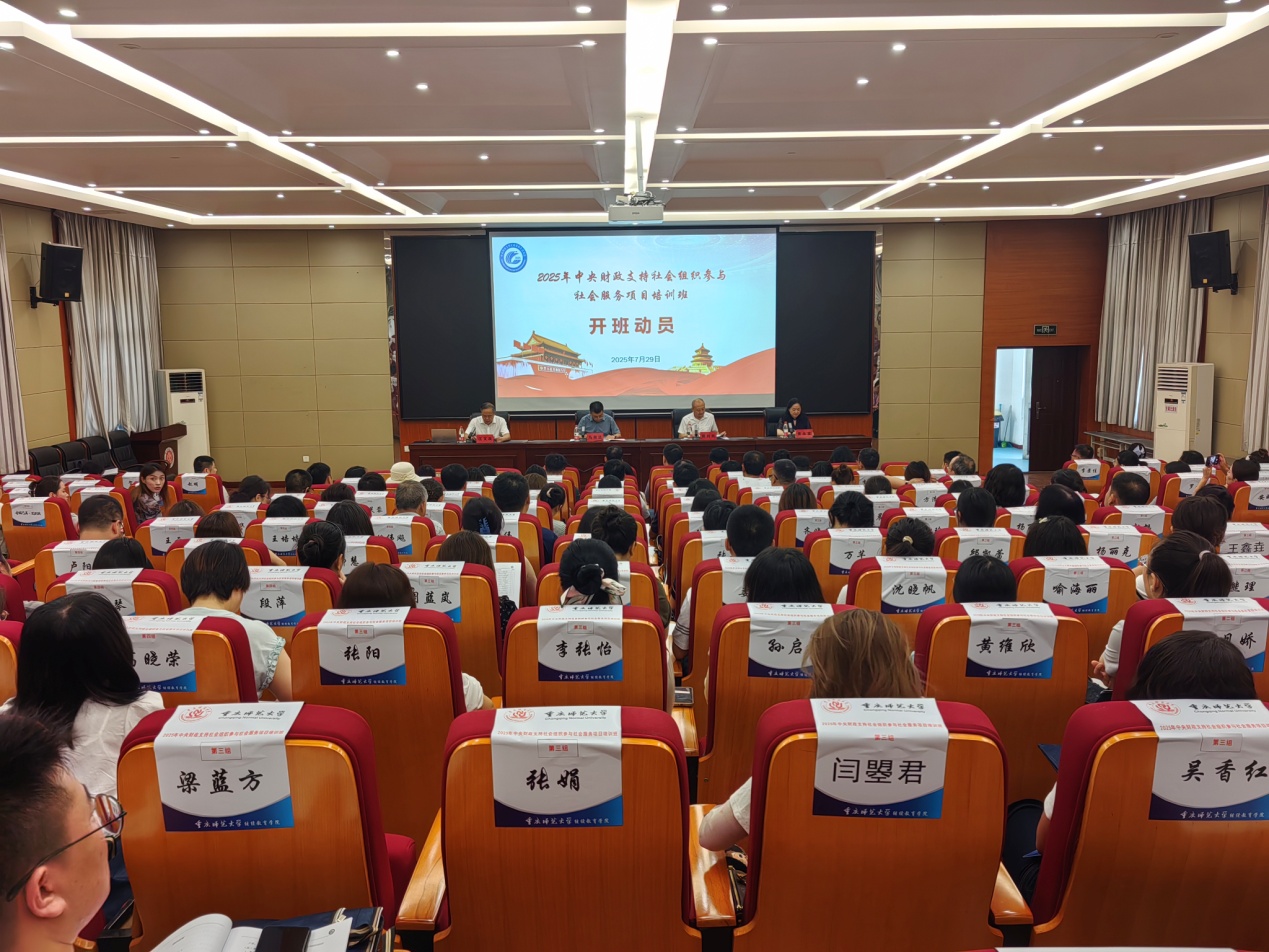 7月29日上午,我校承办的2025年中央财政支持社会组织参与社会服务培训开班典礼在沙坪坝校区第五教学楼5401会议室举行。学校党委常委、副校长黄永宜,民政部社会组织管理局副局长马俊达,重庆市民政局市管二级巡检员周利民,重庆市民政局社会组织管理局局长江文波,学院党委副书记、院长杨思帆及187名来自全国各地的社会组织负责人共同参加开班典礼。