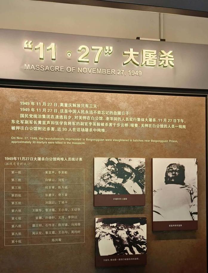 1949年11月27日,重庆解放前的三天,国民党反动派制造了骇人听闻的“11•27大屠杀”。军统特务将关押在白公馆的革命志士分批秘密押往松林坡,进行了疯狂大屠杀,仅有19人幸免于难。