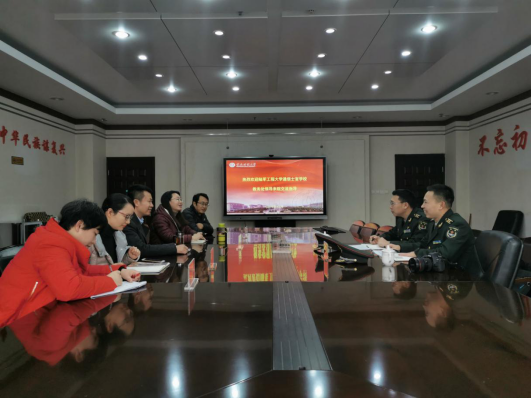李荣院长和张红副院长首先介绍了我校的培训模式以及与陆军勤务学院合作开展新教员岗前培训工作的情况。杨小光副处长和何俊强参谋介绍了陆军工程大学通信士官学校教员培训思路、合作意向及近期拟参培人员的基本情况、培训需求以及时间安排。双方就培训目标、培训方案、培训形式、培训管理方式等问题进行了初步协商。