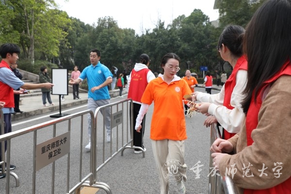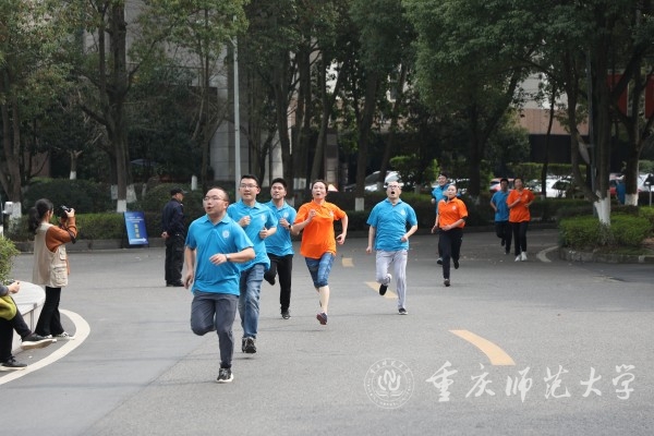 “开跑!”随着校长孟东方掷地有声的口令发出,各参赛选手一触即发,犹如激水从开闸的坝口飞奔而出,“重师橙”和“重师蓝”瞬时铺满了五四环道,参赛者们步伐矫健、斗志昂扬,拉拉队们呐喊助威、热情洋溢,整个校园沉浸在节日的欢乐之中。比赛期间,巡逻车全程跟随,为比赛的顺利进行保驾护航。最后,环校跑活动在全校师生热烈的呐喊欢呼声中落幕。